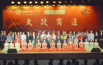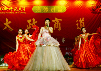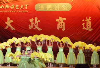 在每一讲的讲解中都穿插了精心准备的节目。观众在悠扬的《远情》中感受到了晋商亘古的魅力;小品《坚守诚信》让同学们在平凡商户的坚守中感受到了诚信的力量;单口相声《百家笑谈》向在场观众展现了古人的为官标准以及他们的博爱之心;一曲《国家》激发了同学们的爱国热情,将现场氛围推向高潮。情景剧《承诺的绿林》把杨善洲扎根深山义务植树造林的奉献精神展现得淋漓尽致,深深地感染了现场观众。道德讲堂在歌曲《美丽中国梦》的美好祝愿中落下帷幕。