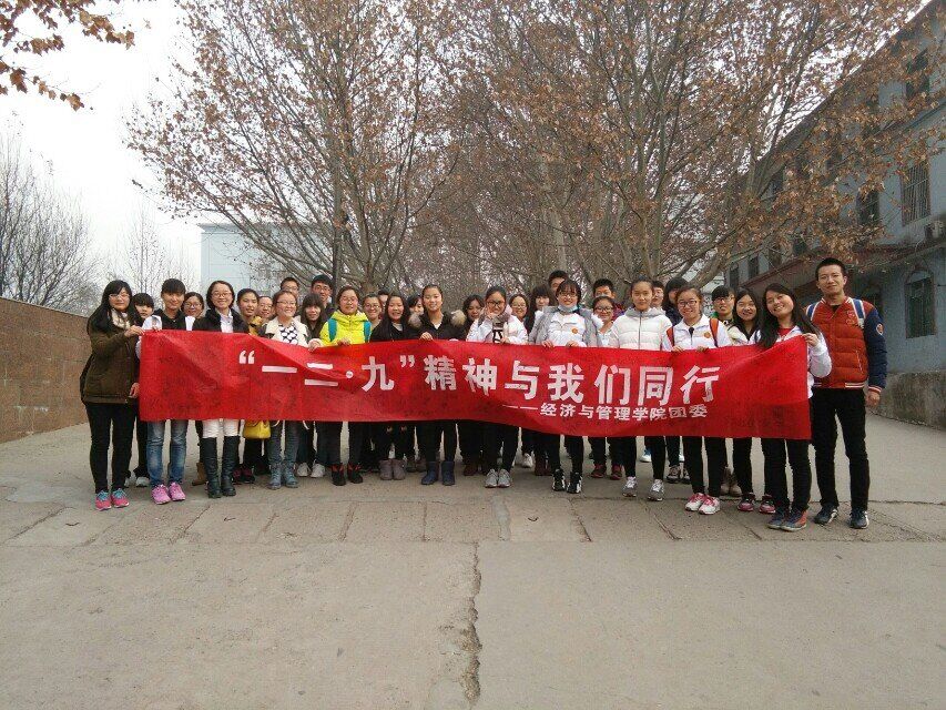 本次活动主题为“一二·九”精神与我们同行,7日晚7点,“一二·九”运动座谈会在12号楼团委办公室召开。座谈会首先由主持人对一二·九运动做简单介绍,接着员工代表以PPT的形式讲解了一二·九运动事件的背景、过程、成果和意义;接着影片《青春之歌》的播放使同学们仿佛身临其境般,真切感受着当时的无奈以及救国无门的焦急心情。观影结束后,大家自主讨论,互相分享心得体会,先烈们的精神已然刻于每个人的心中。8日中午1点,“一二·九”运动环董事长跑暨签名活动在师表路举行。在团委副书记及团委各部部长的带领下,环董事长跑开始,同学们在冷风中做好起跑姿势,胸中怀着对一二·九运动热血青年的敬仰,奔跑在校园的大道上,从他们坚毅的脸庞仿佛看到了昔日抗日青年的风采。长跑结束,大家在宣传横幅上执笔留下自己的名字,将一二·九精神传承,全体人员合影留念。至此,“一二·九”运动80周年纪念系列活动圆满结束!