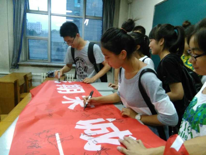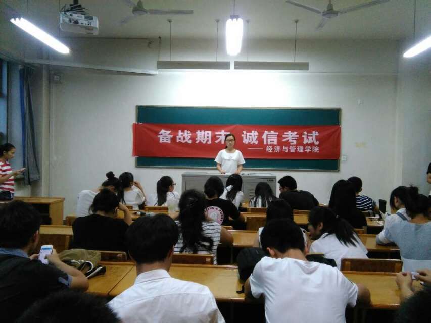 活动共分三个环节。第一环节:各班班长上台发言,讲述自己对诚信考试的看法,对“严肃考风,诚信考试”提出倡议。第二环节:各班学委和大家分享学习经验和备考方法,从各科重难点、考试的注意事项及备考的良好心态等方面和大家作了交流。第三环节:全体人员有序地在印着“备战期末,诚信考试”字样的红色横幅上认真写下自己的名字,有的同学还写下了对自己和同学的鼓励与承诺。