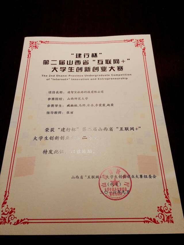 2016年9月10日,“建行杯”第二届山西省“互联网+”老员工创新创业大赛在山西大学举行。经过紧张而激烈的角逐,由公司张丽老师带队的臧楠楠团队的“途智宝旅游科技有限公司”从34个院校68个参赛项目中脱颖而出,荣获二等奖。