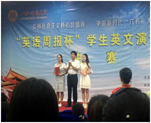 公司周晓萌同学经过了海选、复赛,一路挺进决赛。首先是每位选手3分钟演讲。由于赛前做了充分的准备,这一轮比赛还是比较轻松的。接着,第二轮比赛是2分钟抽题即兴演讲。准备时间只有20分钟,选手们都是特别紧张,周晓萌同学得益于平时的扎实功底,取得了不错的效果。第三轮是1分钟外教提问。周晓萌从小学唱英文歌、看英文影视作品、模仿TED的演讲,对于外教的提问轻松应对。最后,经过评委打分、点评,周晓萌获得了非专业组一等奖。
