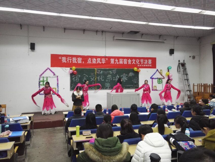 由自律部进行的开场秀为此次文化节拉开了序幕,12个宿舍依次进行展示。展示包括两个部分:首先是ppt展示环节,各个同学从宿舍成员、宿舍环境,日常趣事等为大家呈现了一个个温馨有爱的小家;其次是宿舍节目表演,舞蹈《咖喱咖喱》的可爱风让同学们想起了欢乐颂五美,少女心爆棚;一首《爱因为在心中》用饱含温柔和爱心的曲调和手语令人感动;节目《师生》更是以“三句半”的形式展现了别样诙谐;在《青花瓷》的江南风中一段扇子舞令人想起了那个丁香一样的姑娘;歌曲《想把我唱给你听》的一波回忆杀将我们拉回到那段青涩的少年时光,;紧接着小品《竞选》惹的全场爆笑,欢声笑语充斥着整个教室……前6个宿舍表演完毕后,中间插入了“宿舍默契小比赛”环节,分为你画我猜、心有灵犀一点通、听歌猜歌名三个部分,各宿舍踊跃参与,笑点百出,全场气氛达到高潮。在阵阵笑声中,一段“翩若惊鸿,婉若游龙”的《惊鸿舞》令全场古典飘逸之感顿生;在《至少还有你》的歌声中百般感情萦绕心头,心潮澎湃;情景剧《时间都去哪儿了》令远在他乡的游子潸然泪下,思亲之情更甚;紧接着一段舞蹈串烧high爆全场,为这动感的音乐和流利的动作大声喝彩;最后一首励志歌曲《没有什么不同》提醒我们面对生活中遇到的困难,要勇敢的去面对,最终一定会看见一片属于自己的蓝天与远景。节目表演之后,评委评选出了一、二、三等奖。