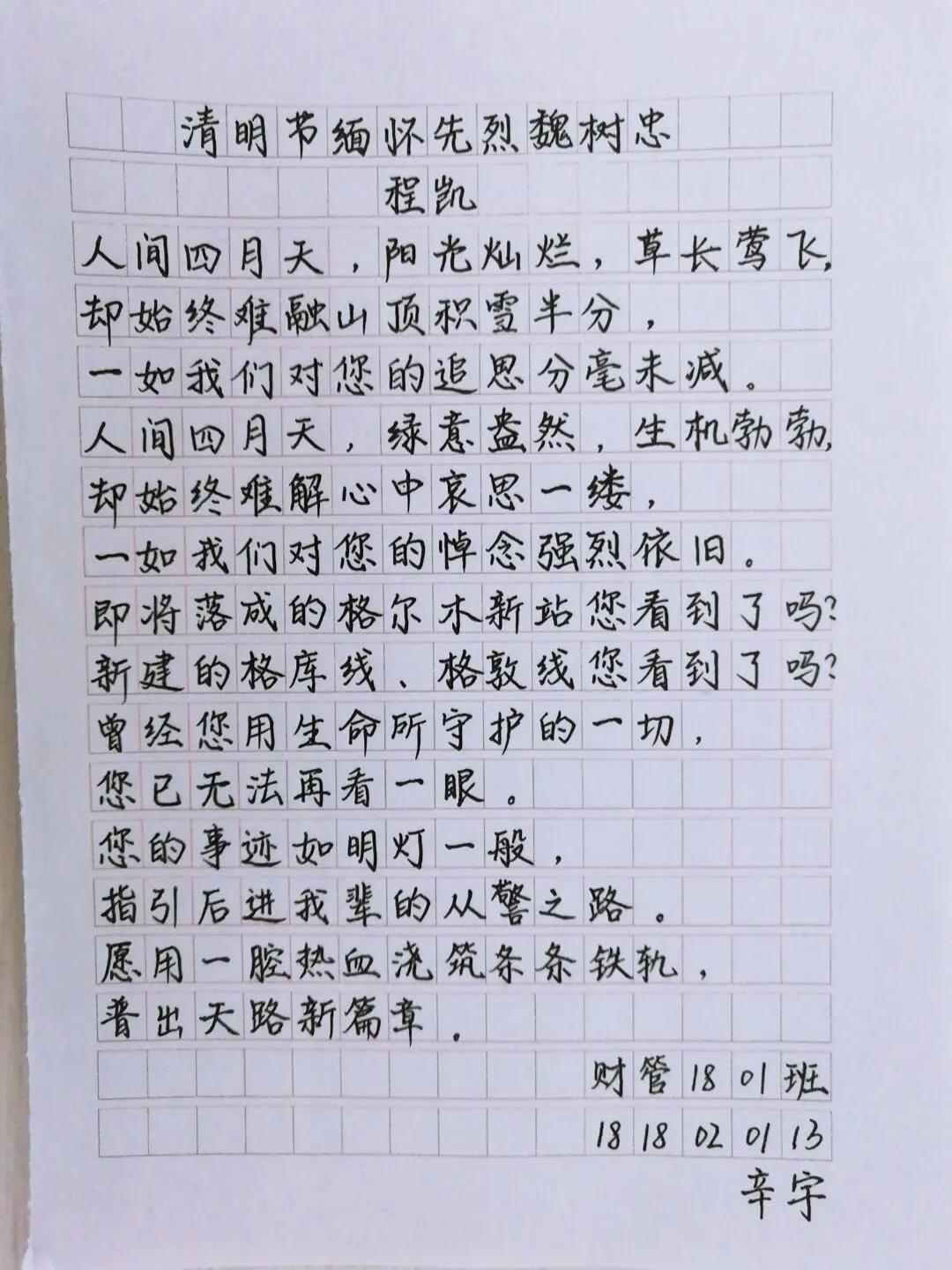 活动共分为三个部分。第一个部分为踏寻清明,各班负责人鼓励同学们积极寻找相关视频,或诵读经典文章,进一步了解清明节的由来与文化习俗,学习相关的历史典故。第二个部分为祭奠英烈,为避免参加聚集性祭扫活动,各位同学通过居家登录中华英烈网、中国文明网、中国青年网等专栏,线上向英烈敬献花圈,颂祭文,留言评论。以这种“云思念”的方式表达对先烈的无限追思。第三部分为“学习教育”作品展,通过歌曲,朗诵,海报,绘画,视频等形式表达对一线抗疫人员、志愿者的敬意。